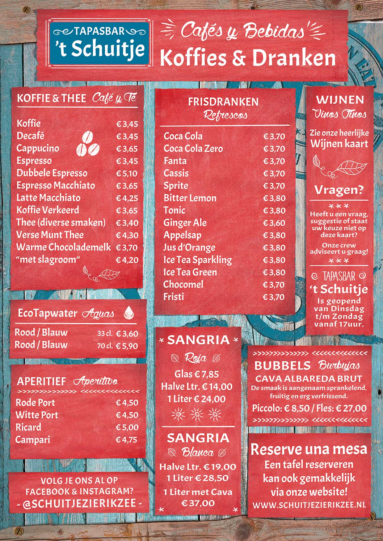 Onbeperkt tapas eten van dinsdag t/m zondag voor €39,50 per persoon. Kinderen van 3 t/m 7 jaar à €21,50 en kinderen van 8 t/m 11 jaar €24,50.